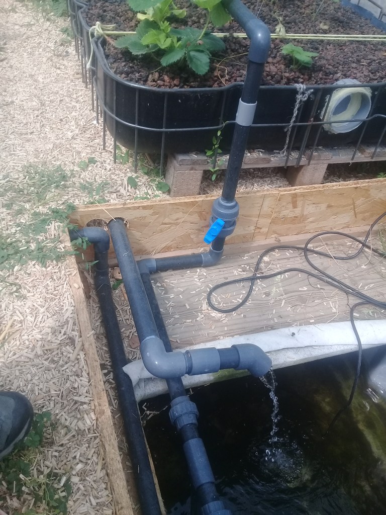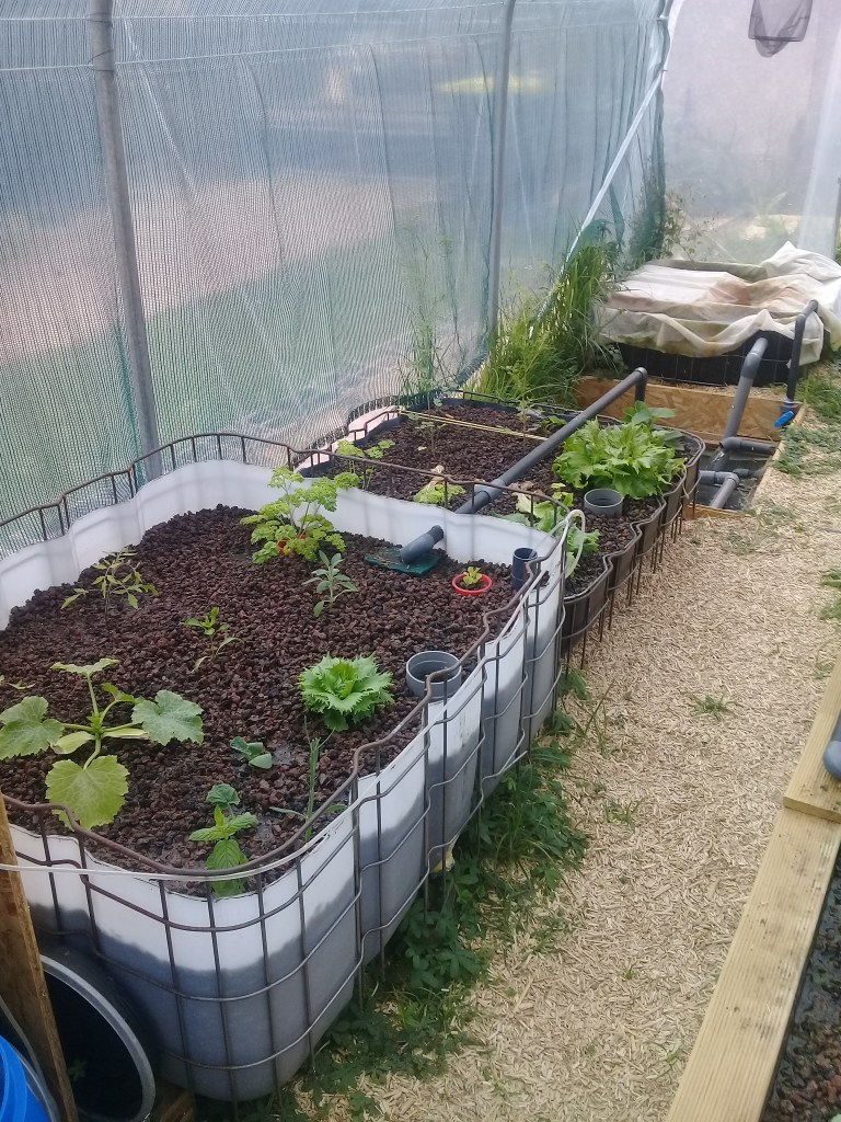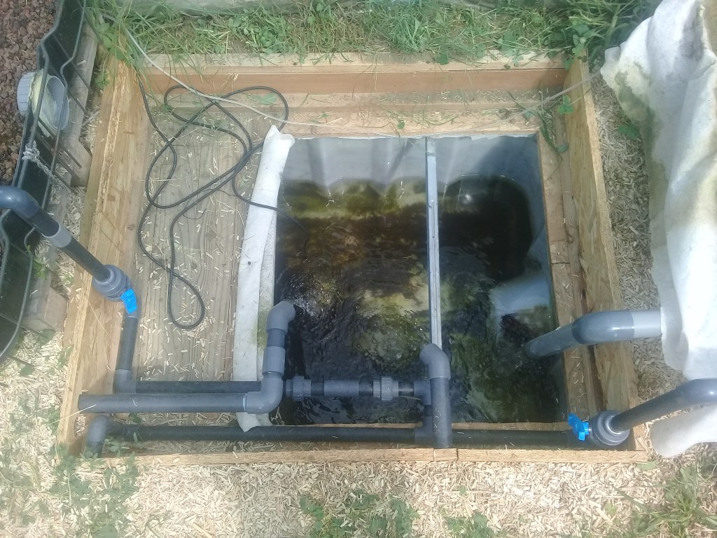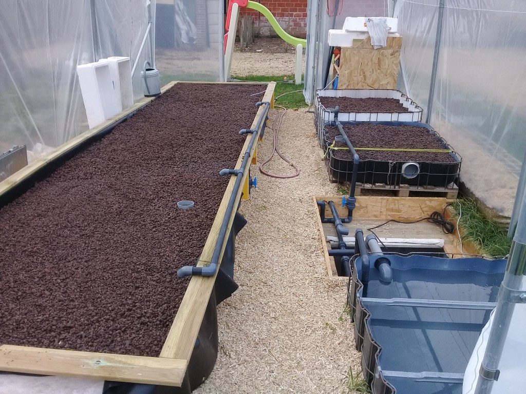 En route pour la mise en place des bassins : les poissons, la décantation, les plantes, et bien sûr tous les tuyaux et les pompes qui vont avec, le tout sous une serre.