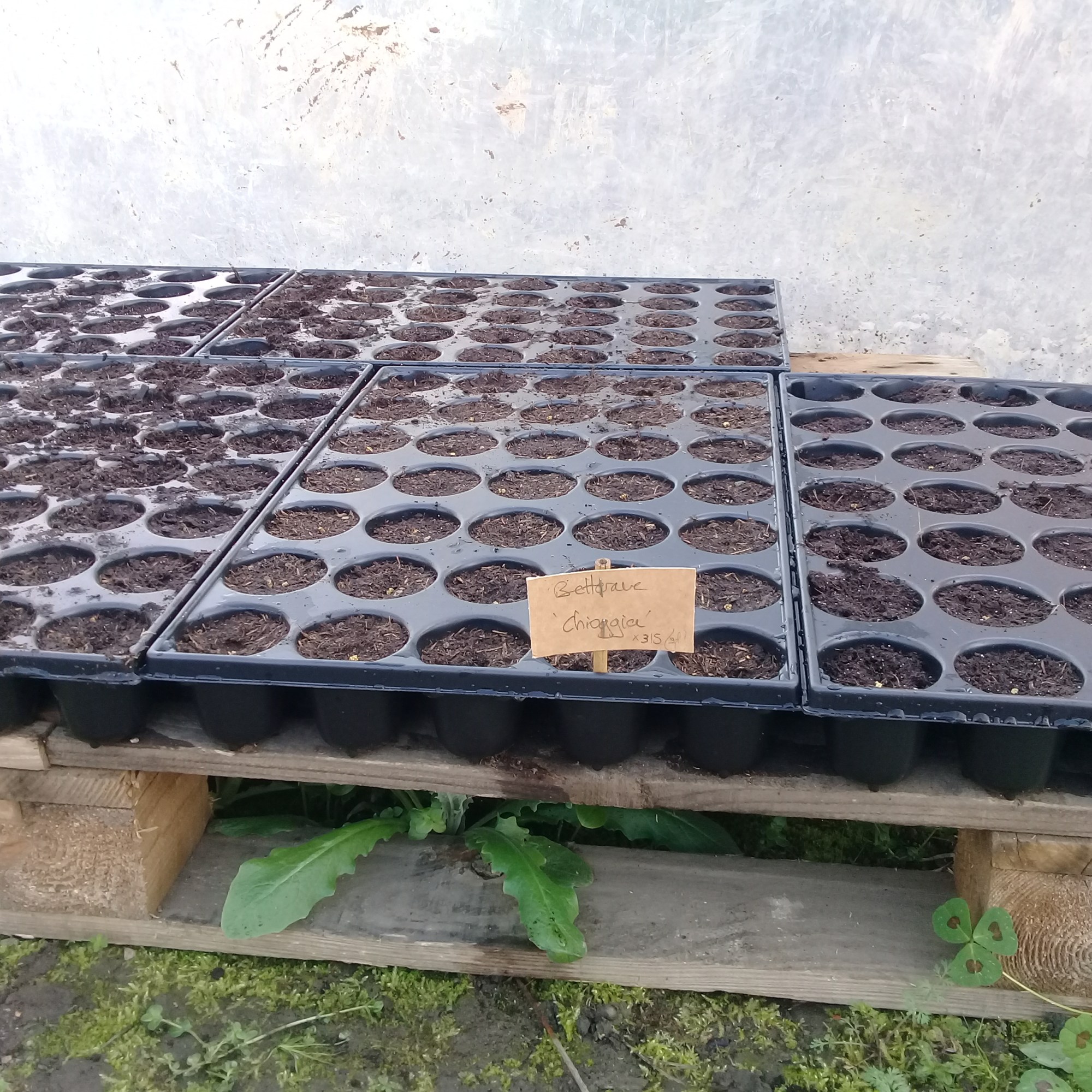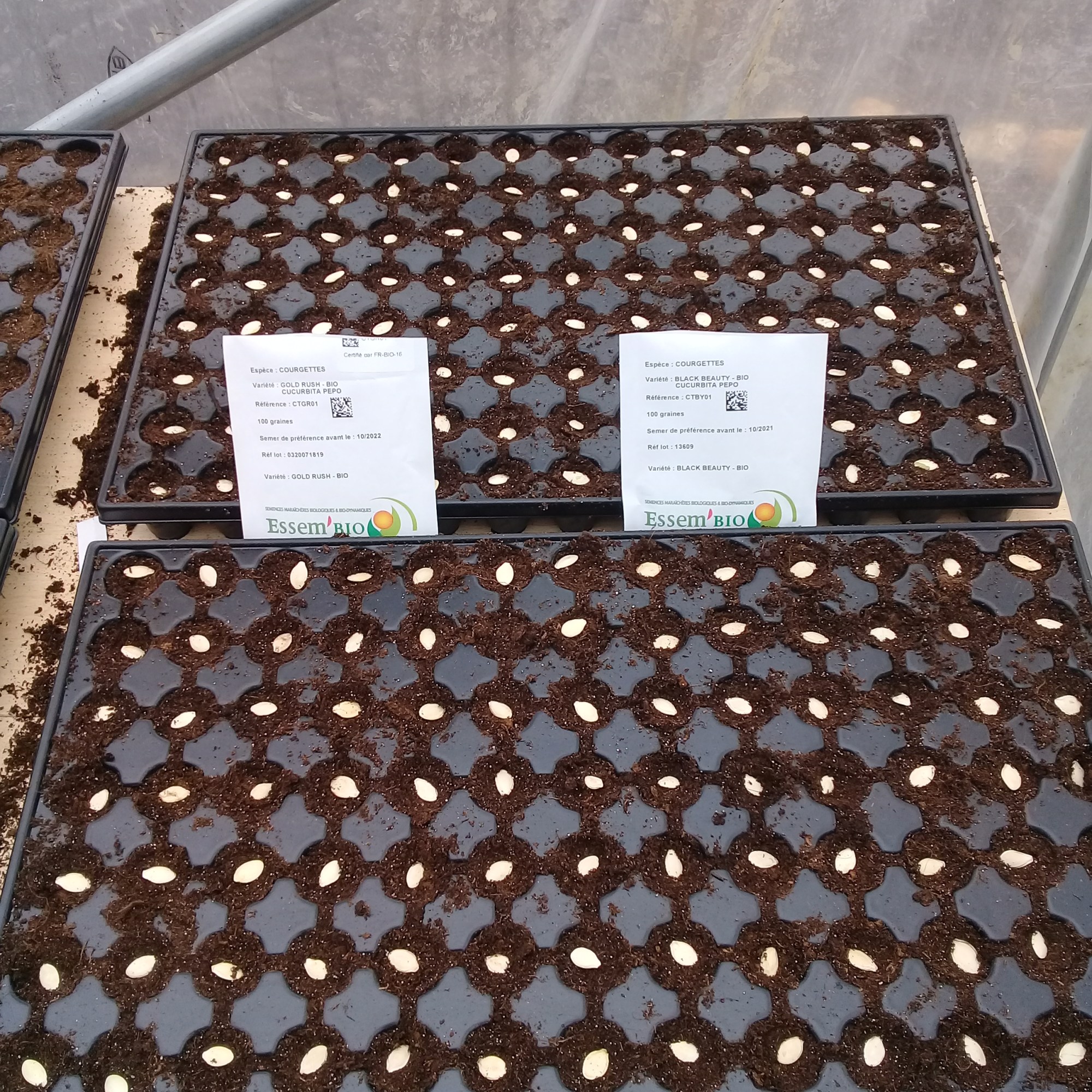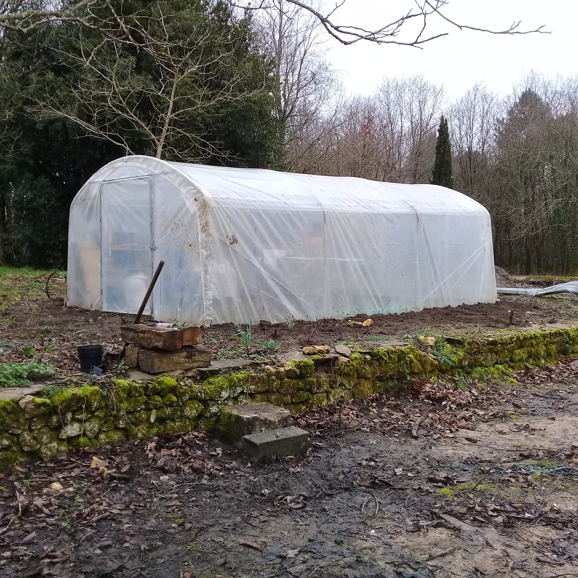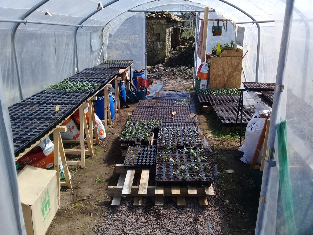 Avant d’entrer en scène en pleine terre, les semis se font en coulisses, sous serre. Pour cela, avant l’implantation des deux grandes serres prévues dans la suite du projet, c’est la nôtre qui a déménagé depuis la Normandie (oui, celle-la même où nous avions testé l’aquaponie).