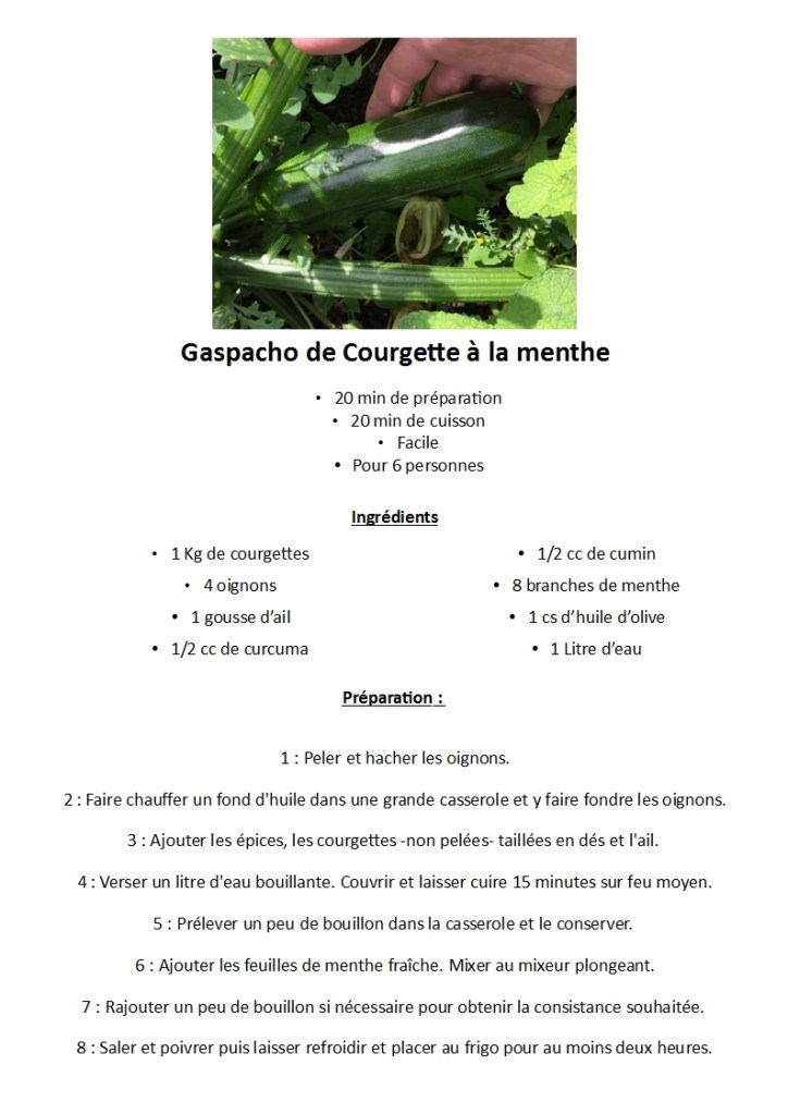 Au cours de cette année à la météo particulière, les courgettes, elles, s’en donnent à cœur joie dans nos jardins. Nous avons donc testé plusieurs recettes voire plusieurs dizaines de recettes. Je vous en propose 2 cette semaine : Le gaspacho de courgette à la menthe et les beignets de courgette d’Ophélie. A déguster sans modération.
